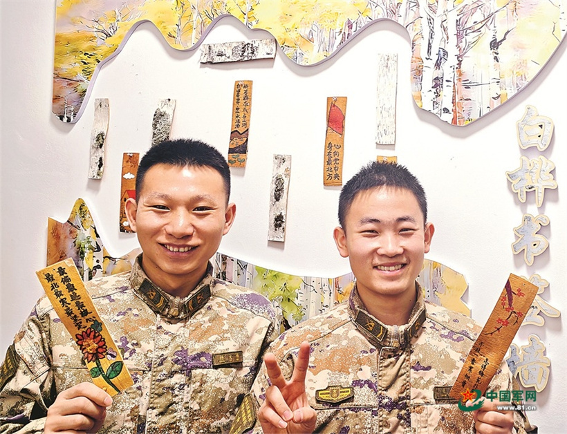 两名战士展示用树皮制作的书签。(马庆睿 摄)