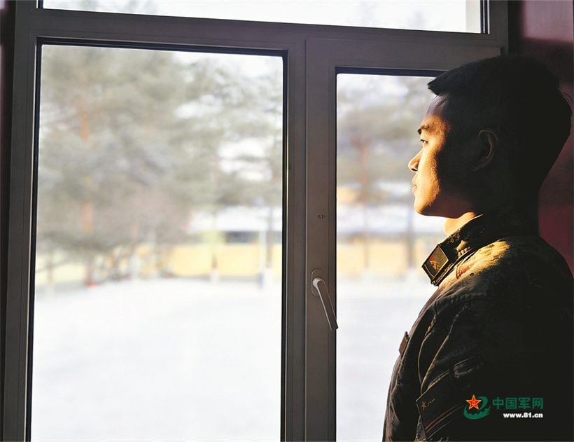 一名战士在窗前眺望雪景。(马庆睿 摄)