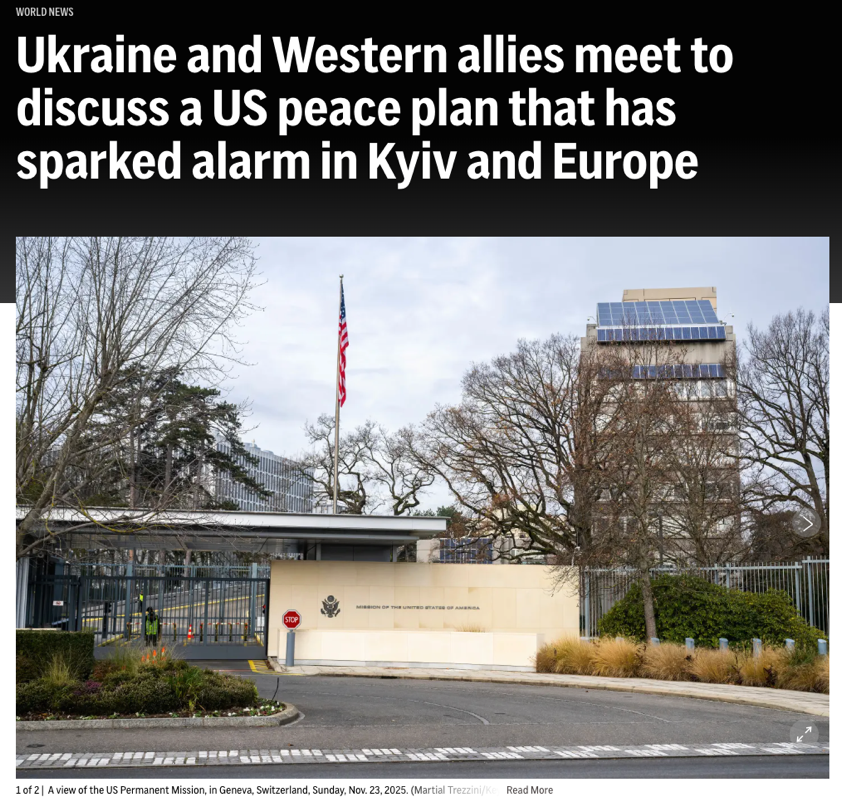 当地时间11月23日,美乌就“28点”新计划在瑞士日内瓦举行会谈(来源:央视新闻)