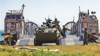 资料图:2024年3月12日,在美日“铁拳”联合夺岛演习中,参演人员从日本登陆艇上卸载轻型装甲车(来源:中国国防报)